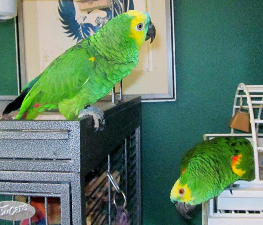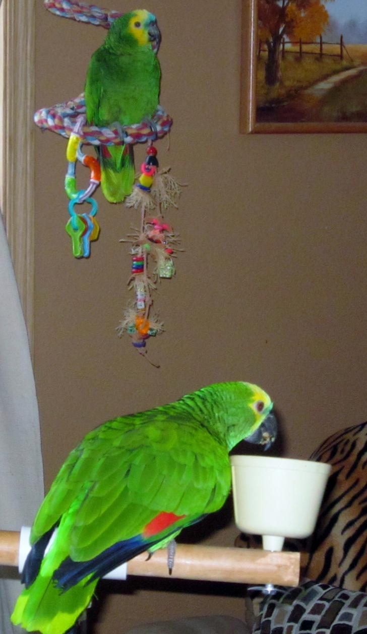 Luvparrots Posted July 9, 2014 Author Posted July 9, 2014 Lulu and Louie after an afternoon in the sun. All four parrots were misted and loved it. Lulu's former owners said she hated to be misted/sprayed. Wrong she was very receptible. I consider myself very lucky as I have a 6-year-old male amazon who tries very hard to do as I ask and a 33-year-old female amazon who is very sweet. No squawking or screeching (well maybe just one or two in the am to clear the pipes). I believe very strongly that being calm and assured has a lot to do with how our parrots react. My parrots all four of them watch me and my reaction which I believe has a lot to do with how they react in return. Body language: if a person is tense and hurried our parrots react the same as they are unsure of how the human will react so they are on guard. Relax and enjoy and so will your birdies.