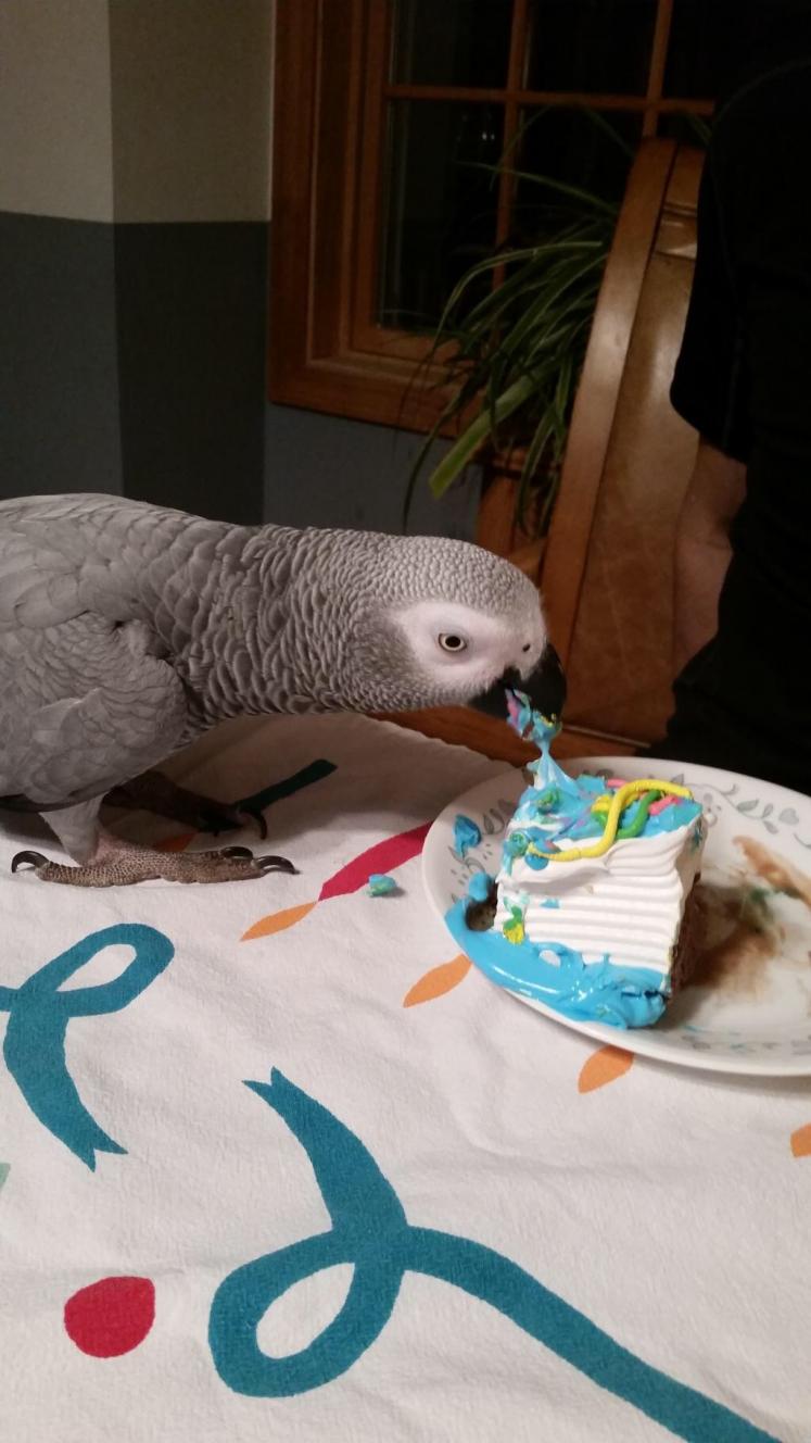 Talon Posted March 1, 2015 Posted March 1, 2015 hey guys....love Febuary in our house! Rikki, Nilah and I have been around long enough to know what "birthdays " mean in our house........ WE HAVE 2 ....that's right 2 this month!!! Usually Bird puts us in our cages cause other people come over....so we miss out on the yummy stuff...but last night...Bird let us join in the birthday party....and we were so excited! Bird kept calling us vultures (whatever that is, guess it's good, cause she was laughing). We circled in around the table and marched on over to this: Nilah hates cold, so she refused to join in the ice cream cake.....told ya she was dumb!