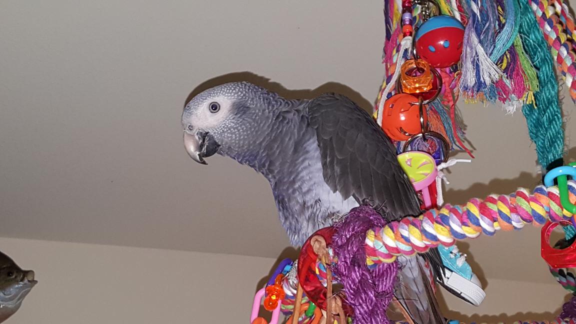 Charlie Parker Posted April 14, 2016 Posted April 14, 2016 (edited) Hi All, I'm John. I picked up Charlie Parker, my Timneh African Grey, at the end of October of last year, 2015. I found him online after researching the behavior and learning ability of African greys, I found it very interesting and challenging. Charlie was hatched on the 15th of July 2015 so he is approaching 9 months old. Let me tell you... I am beyond words on how to describe him, he is such an attention getter, loves to cuddle, and just flat plain astonishes me everyday. I think I love him more than any other "animal" I have ever had. I am 46 years old, have a partner of 10 years and I am retired from the navy, 20 years. Yes I still have a job doing the same exact thing I was doing in the navy but as a civilian, sweet job and pay. I live in Washington state on Whidbey island in the city of oak harbor. Charlie has only met one other bird that is a conure and likes to "beak " with this bird (Tilly). Tilly doesn't like that but does tolerate Charlie I suppose. Charlie really likes to be outside and will "cry" if I don't take him with me when I go outside. I am now associating that with asking him if he wants to go outside, yes he is clipped, I asked not for him to be clipped before I got him but yes he was clipped when I got him. I want to let him grow out new feathers so I can begin the scary task of letting him learn to fly. Going outside will only be done with his harness on when he gets those new feathers going on. Right now he just gently glides while he flaps like crazy but he learning to feather out his landings instead of thumping on the ground, such a good boy! He is learning new things everyday which just amazes me and puts such a smile on my face. Charlie is out of his cage ALL day with either my partner home or I, when we're not here or have him with us, we have to put him in his cage, sad but safe. I try and introduce him to new and different things occasionally so he doesn't get to freaked out if I show him something new. right now he adjusts to new items in about a day or so, his little growl is very amusing, I imitate him and he just looks at me like no! I'm suppose to do that, not you! He bit me pretty good about four times the first evening we got him, I learned I was going to fast. Have not seen blood since the first day. Charlie knows that if he bites we ignore him for a little while so he doesn't bite down hard anymore. We have this bird human language going on, I know what he wants already, is that scary lol. He is a shoulder guy and doesn't have issues with hanging on, I am very gentle and move slow for him so he doesn't loose his balance while he's on me. Andy, my partner, is a little more stern with him in that when andy wants a kiss or wants to pet Charlie, andy gets what he wants. Go figure, Charlie Parker has bonded more with andy than me. I also get a lot of love from both so I am happy. Charlie eats very well. I give him a local pet store mix of seeds and pellets along with zupreem fruit blend and smart selects also a little bit of harrisons high potency fine pellets. I also add in yogurt sunflower seeds like 7 or 8 seeds on top of his food with a couple banana chips and pumkin seeds topped off with some bee pollen. during the day he also gets a little bowl of mixed veggies. His new favorite treat is mandarin oranges with juice, just 2 little slices of oranges though. Fresh water with a splash of aloe vera juice twice a day. He weighs around 300 grams, I weigh him about 2 times a week. alright thanks for reading, I look forward to being a part of this get together. Edited April 15, 2016 by Charlie Parker try to add picture