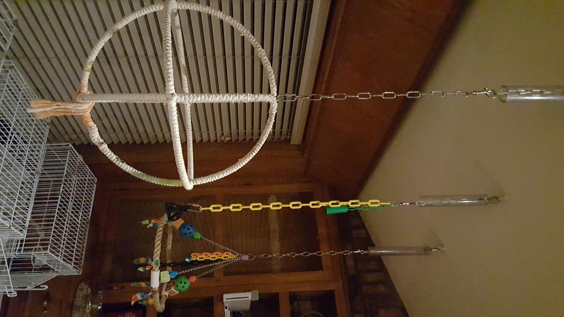 SRSeedBurners Posted April 16, 2016 Posted April 16, 2016 (edited) This site sucks trying to post from an android phone. I got some pics but one is missing, the shot of our living room 'perch' area. As I mentioned we use hanging 'perches' for the birds as I got tired of cleaning the floor standing perch. It went into the cone crusher fire pit outside. I'll add another post later or edit this one but for now... Everything is hung from hooks I mounted in the ceiling and movable from room to room... Orbit, hanging chain with bells (an absolute favorite of Greycie's) and the three chain ring that they all love to fight over. Better pic of the three chain ring... Edited April 16, 2016 by SterlingSL