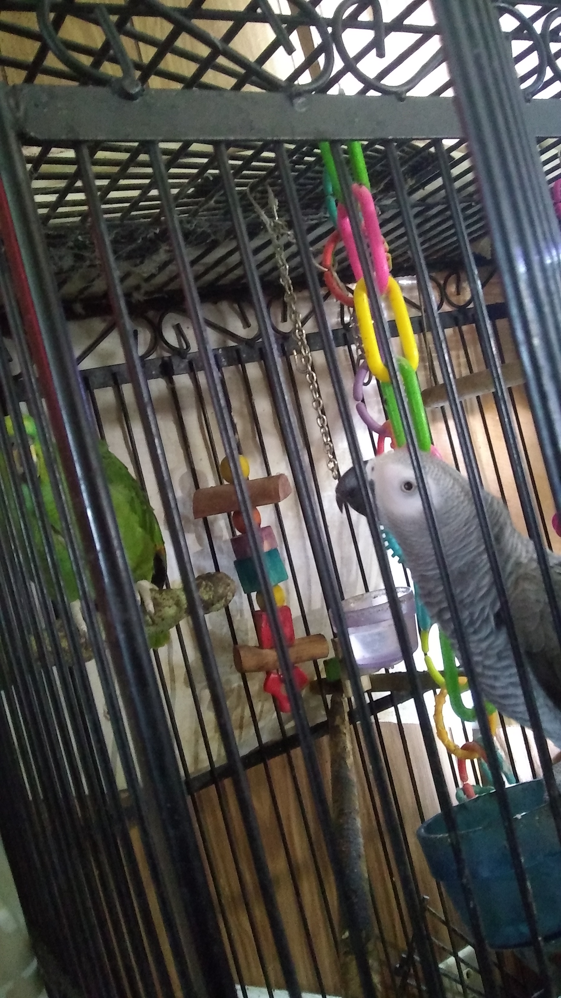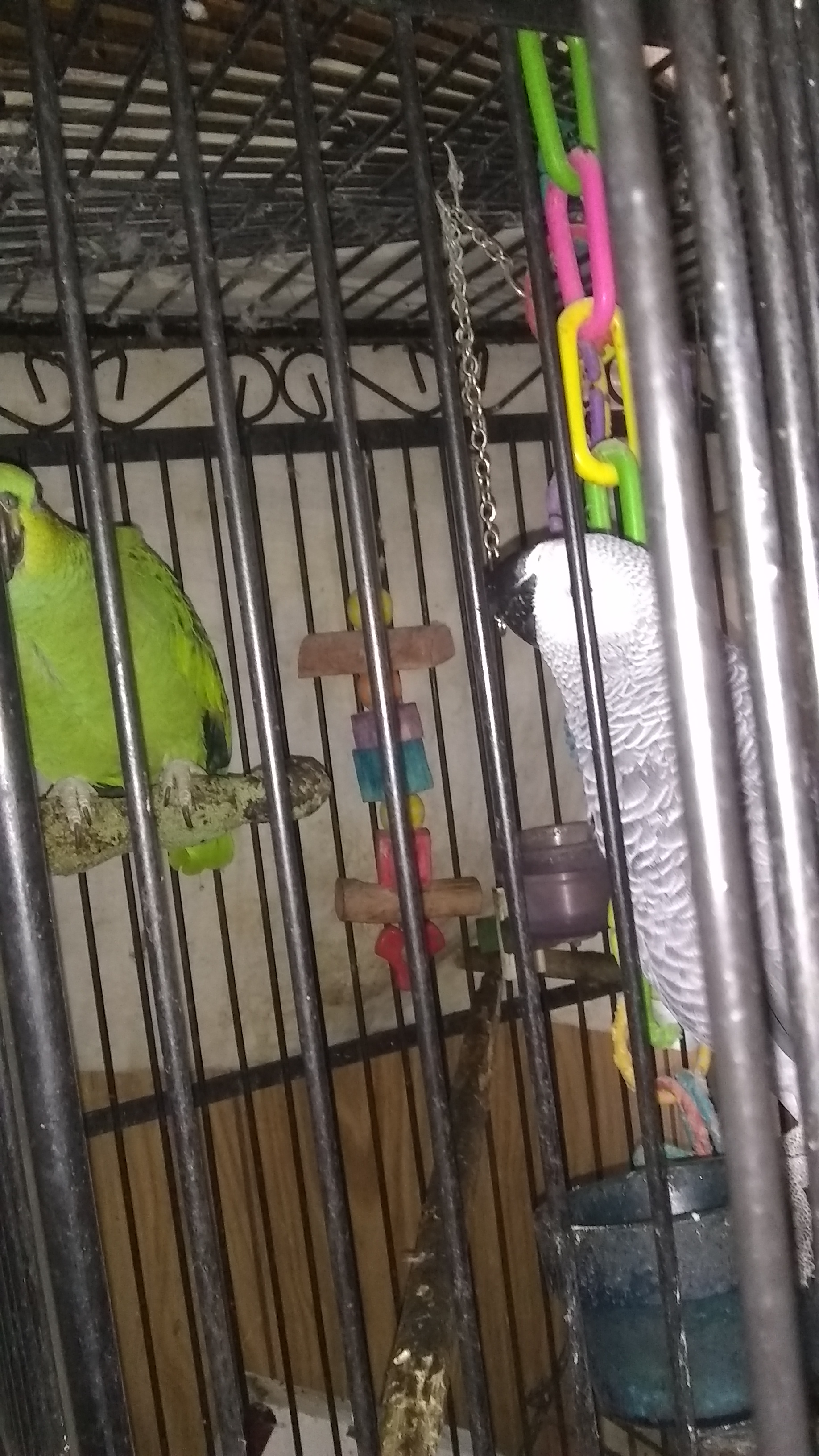 Jayd Posted February 17, 2018 Posted February 17, 2018 Maggie here...Today, I was resting and Joe climbed down from my shoulder to Salsa's cage (FIRST TIME EVER!) and entered it, proceeding to snack in Salsa's seed cup while Salsa looked down in horror from her cornered perch in her cage at her uninvited and unwelcome house guest. Luckily, I happened to have my phone on me and was able to snap off a couple of poor shots before Salsa made a hasty departure the long way across her cage...hahahahaha! 2