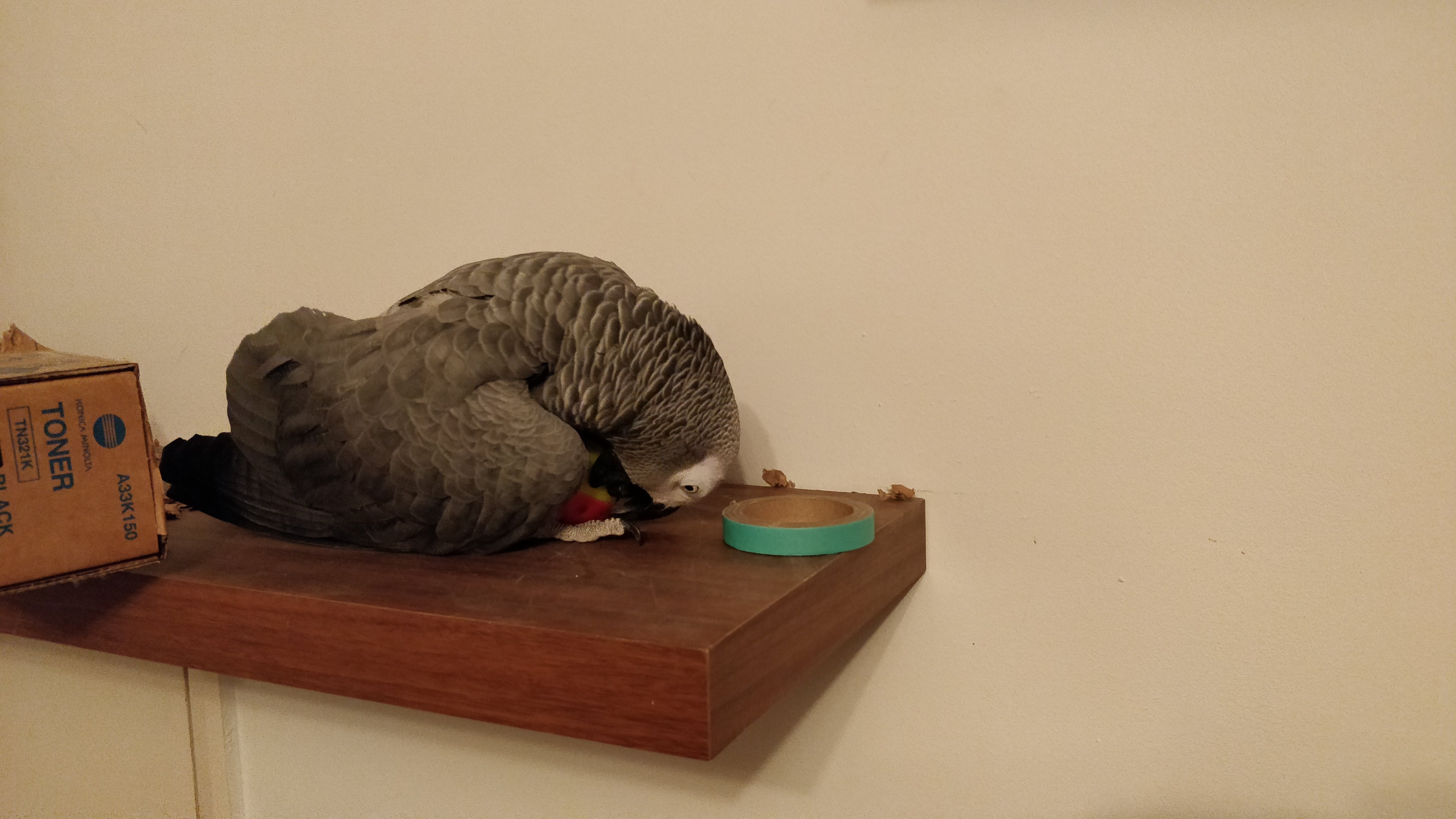 I will hide it away for now as I don't want him to get confused or frustrated. He 'played' with it for about ten minutes or so, holding it in his foot and beaking it/biting it. Then he dropped it off the shelf. His wings were still drooping for another minute or so then he went back to exploring and pushing everything off the shelf.