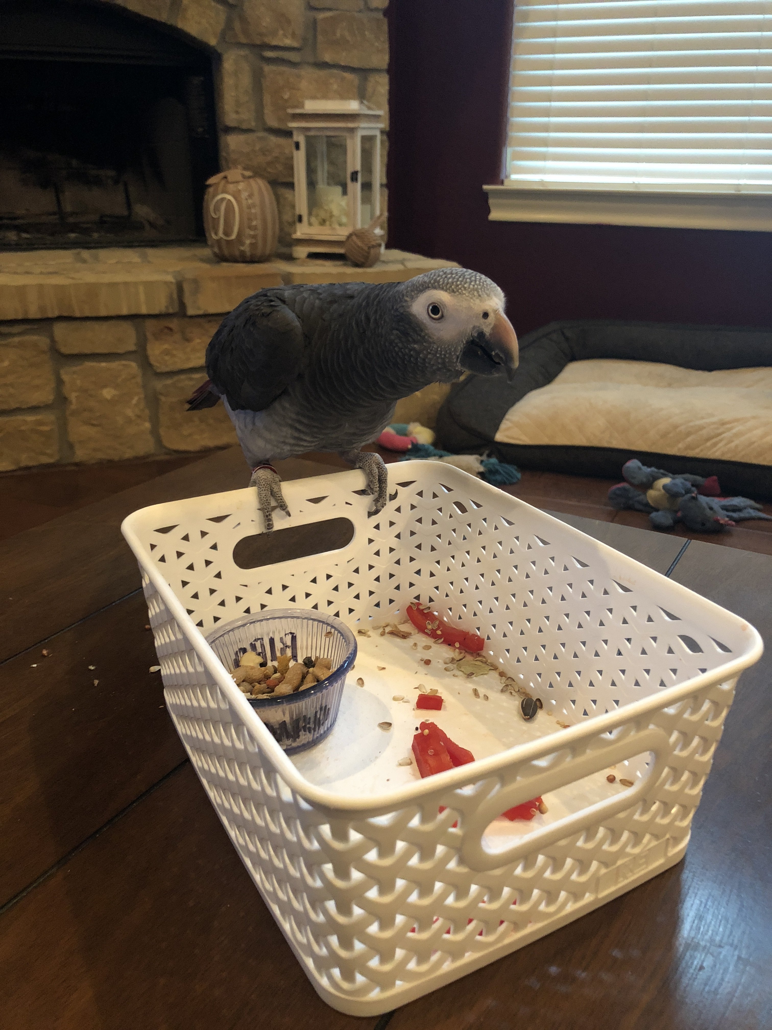 Guest Posted April 8, 2019 Posted April 8, 2019 Hello all! My husband and I adopted our ~9 y/o TAG, Schooner, about 7 months ago. We got (rescued)  him from a family who I honestly think did not treat him well (they used welding gloves to catch him and literally throw him into his travel carrier when we came to pick him up 😳ðŸ¤ðŸ˜) and I don’t know much about his early life other than he spent most of his time in his cage. I’m a marine mammal and dog trainer and am well versed in positive reinforcement, reading body language and building a good relationship with your animal. But let me tell y’all, this bird is something else! I’ve had some major success with him and I have definitely learned some of his tells. But I’m having a lot of problems with his biting. I can only ask him to step up onto my hand when he first wakes up in the morning and he’s doing that whole regurgitation song and dance. Other wise I have to wait for him to climb down his cage onto the floor and then I can pick him with this little organization box (we call it the magic box, pictured below). He’s eating well, bathing, interacting with toys and can be very vocal (mostly whistles, clicks and other vocalizations, no words). I try sooo hard to find ideal times to ask him to step up and reward him for being good and for also making it variable (if he steps up he doesn’t have to be with me forever, he can go back to his cage or he can go sit on his magic box somewhere while I read or something). But homeboy doesn’t just tag you, he grinds his beak into your skin and doesn’t let up. Ideally, I would love to find a bird trainer/grey specialist that either I can go to or can come meet him (so someone in the central Texas area?)and give me more insight on how to help this lil bird be successful. I understand that he might not ever be affectionate with me but I would like to be able to pick him up consistently and be able to move him to clean his home and socialize with him etc. Any and all advice would be appreciated! -Schooner’s Mom 3