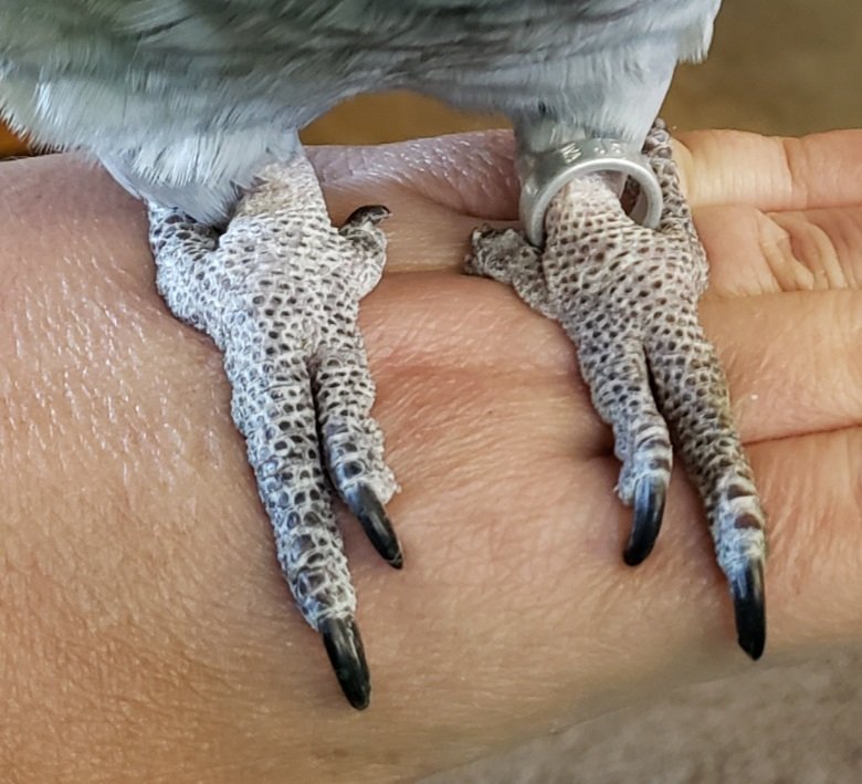 JennS Posted July 18, 2020 Posted July 18, 2020 Vannah seems to be a bit off balance or unsure of her footing. We chalked it up tho nervousness, but is not getting better. When we first met Vannah we noticed her back inner toe on each foot appeared deformed. Her former companion said she had always been like that. The vet made mention of them as if something had happened to her. Now that you have background info, I am wondering how much shorter are her inner toes, compared to normal (see attched pics)? I'm also wondering what, if anything, I can do in and out of her cage to help her. She climbs well, but has a hard time just standing on fingers and people, and she is overly causious about transferring from perch to perch. 1