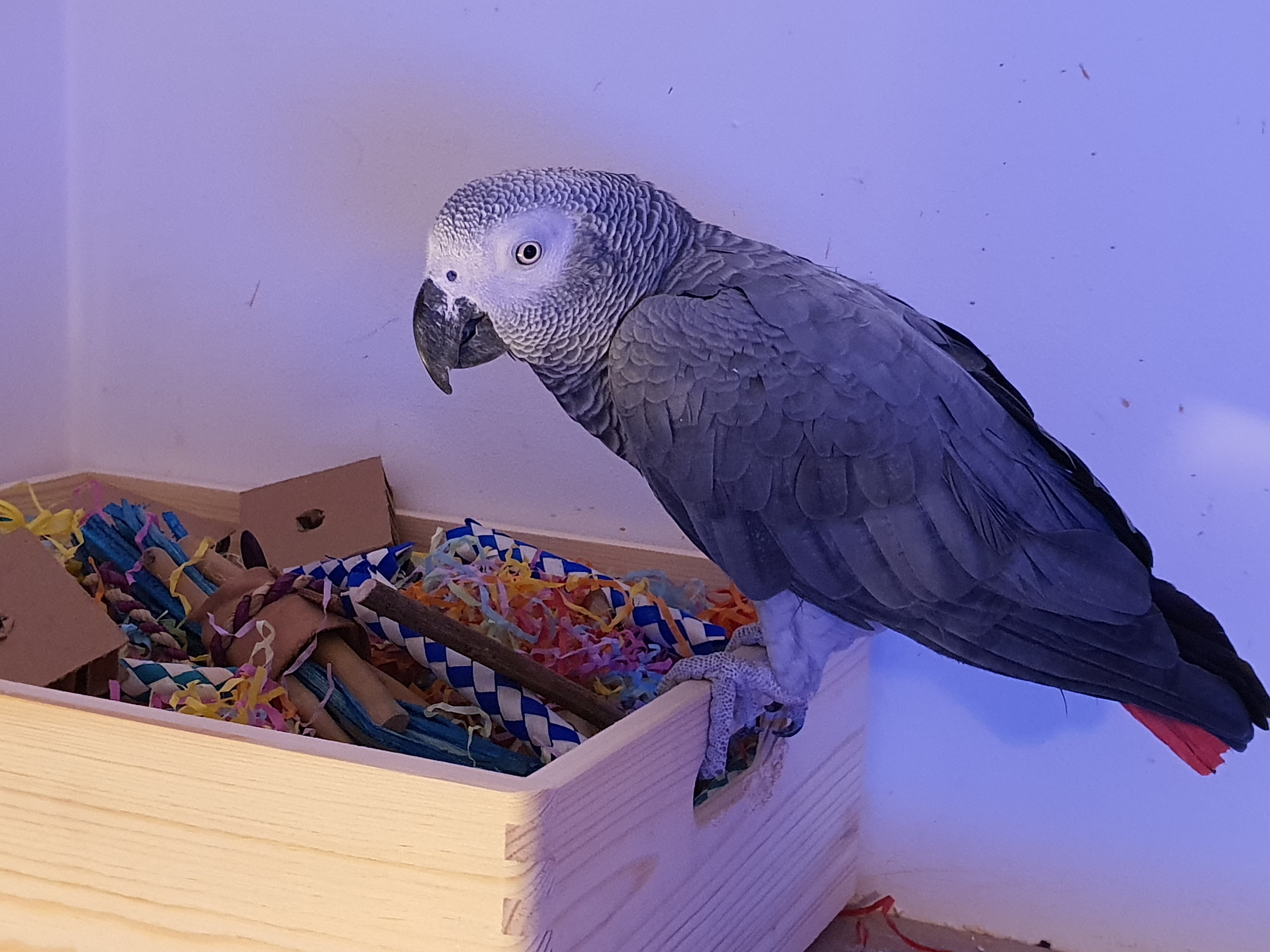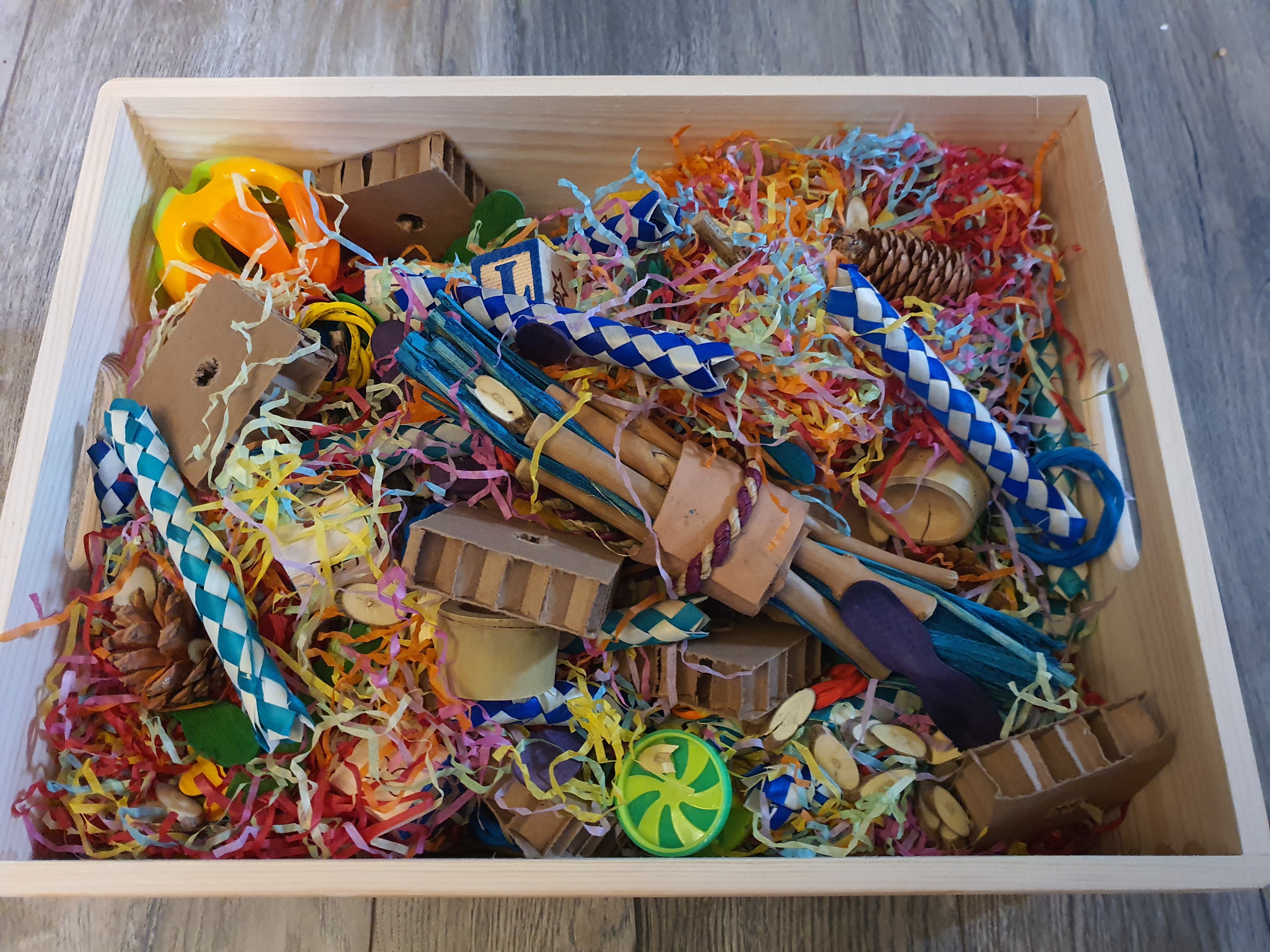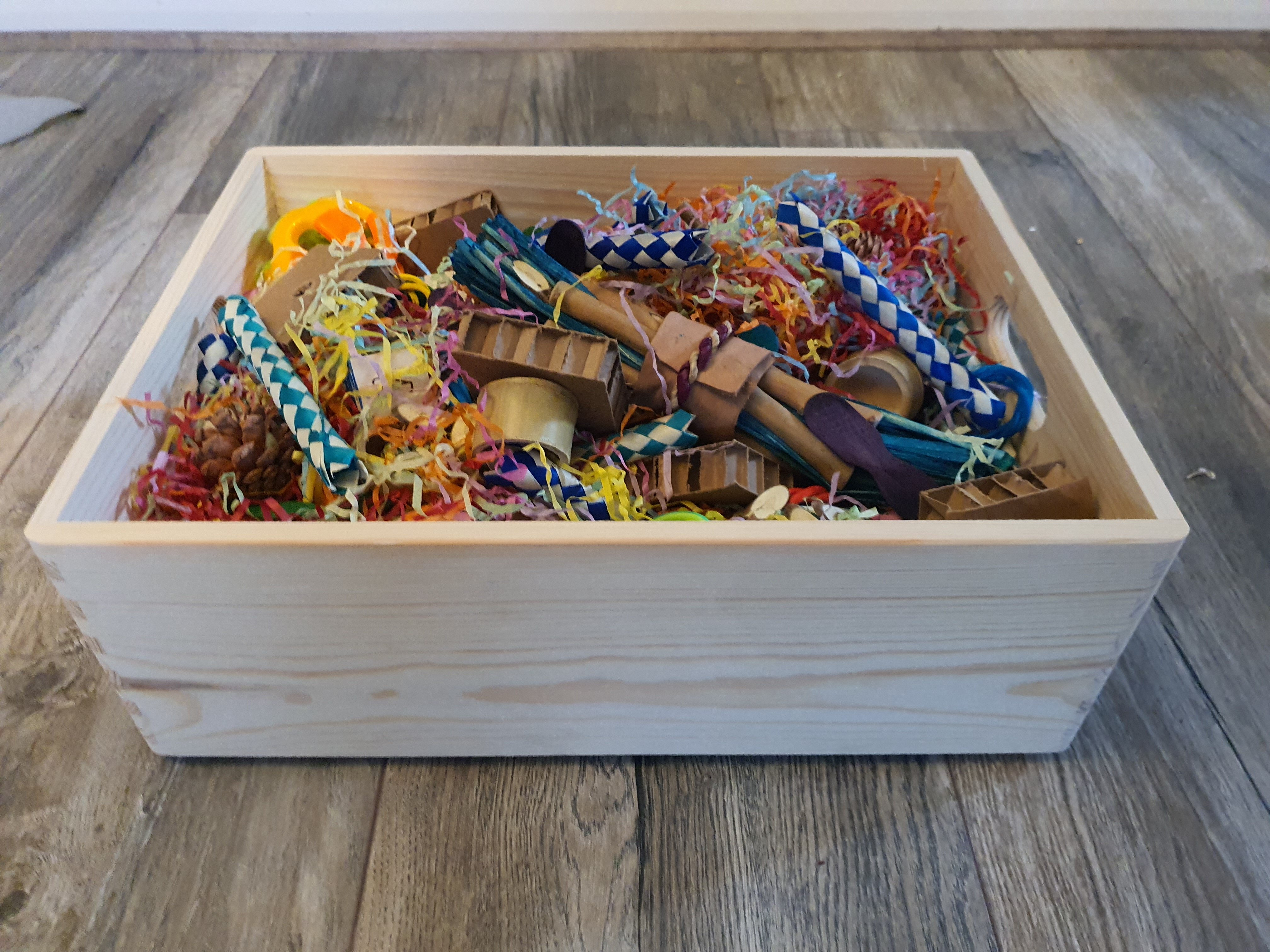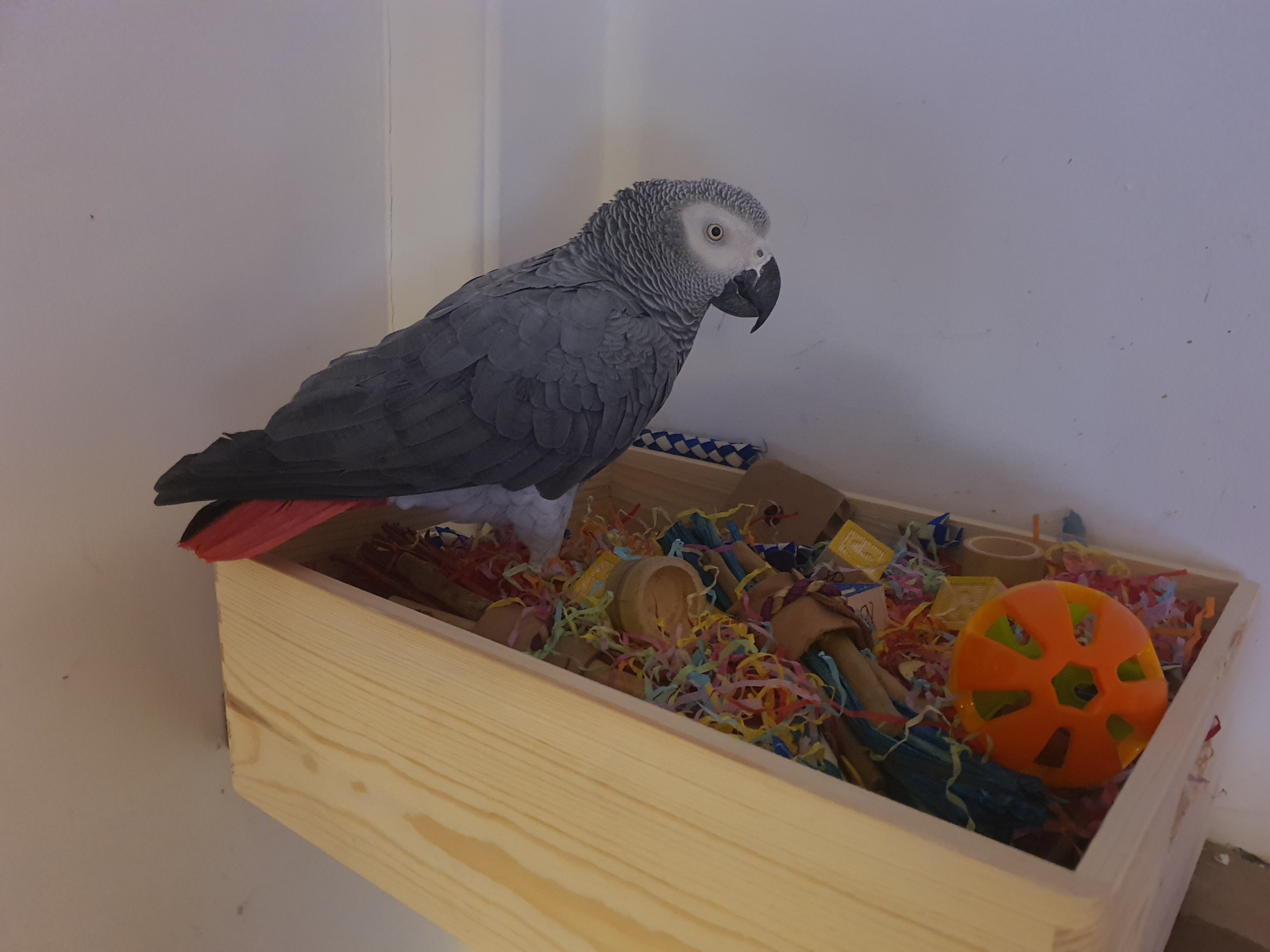 neoow Posted December 29, 2021 Posted December 29, 2021 I did something a little different for Alfie's Christmas present this year. I normally get him a couple of new toys to hang in his cage. This year I decided to add a new toy to his shelves that he likes to play on in the living room... mainly to try and stop him chewing on the wall! I found an untreated wooden box and stuffed it full of crinkly paper, wood chips and foot toys. It's been a big hit and after a bit of side-eye Alfie hopped up and started exploring. He has great fun rustling through the box and finding toys to fling out of it... most of them usually land on the sofa below... or on my head if I'm sitting there. 😂 3 1