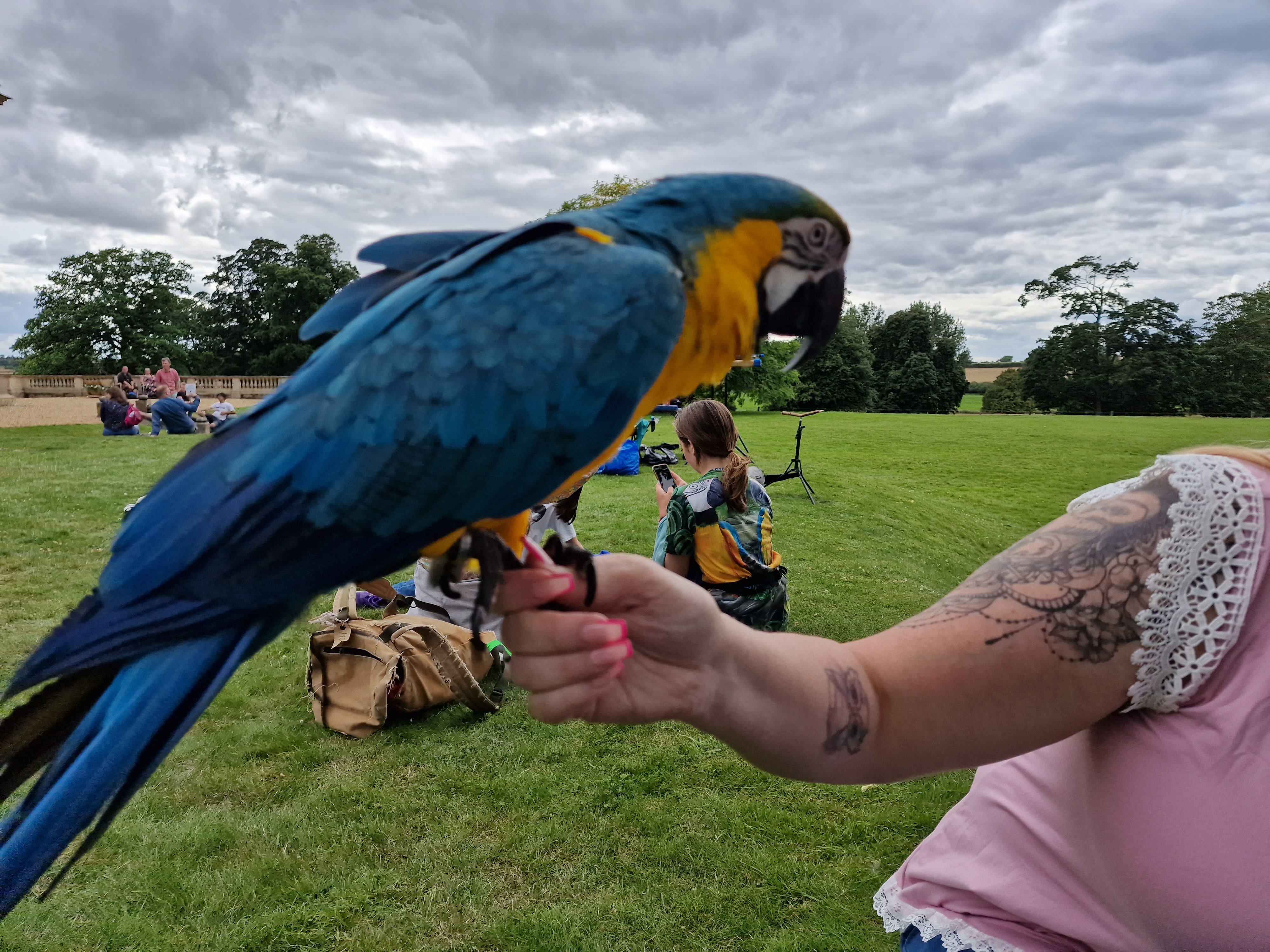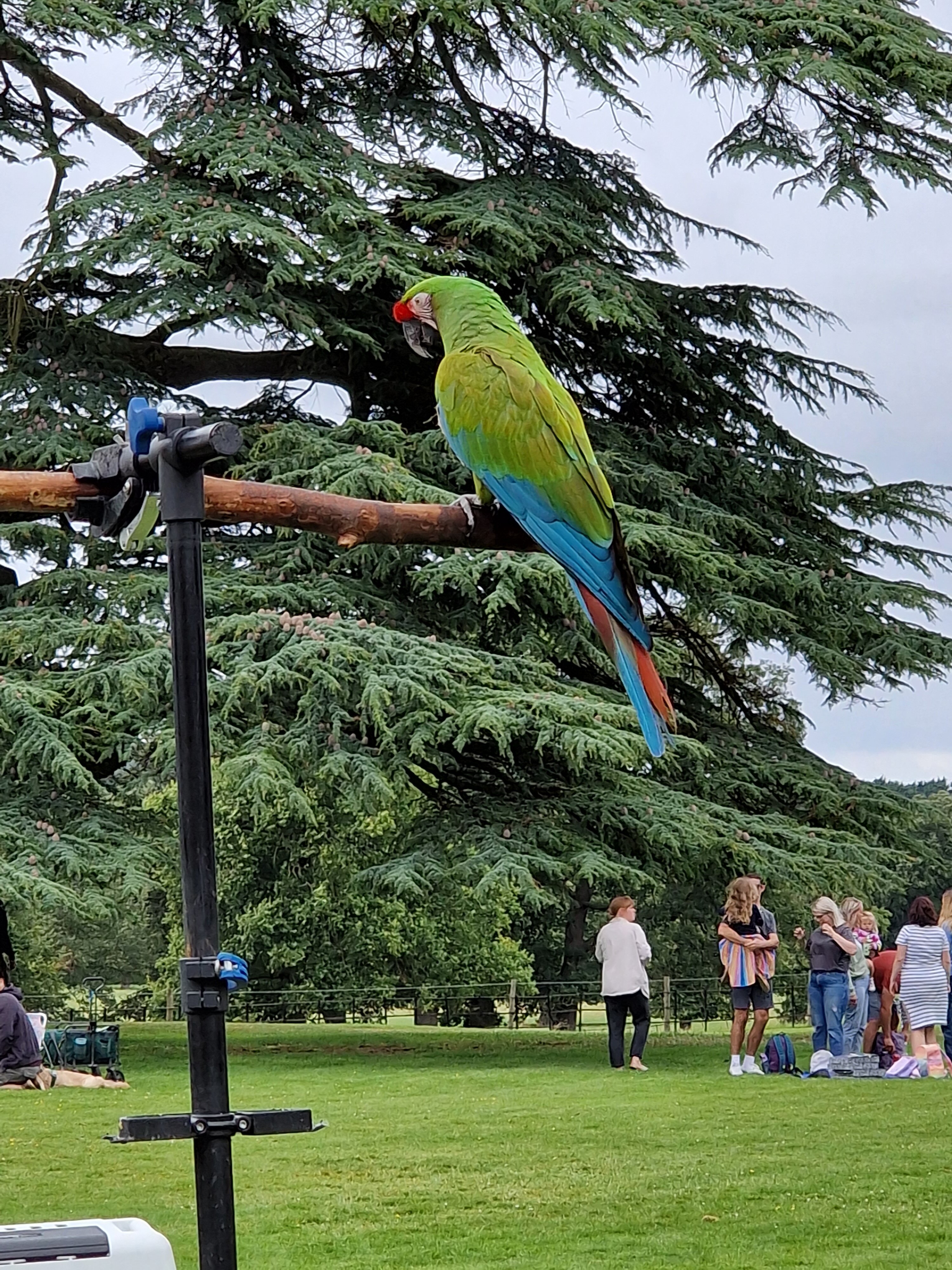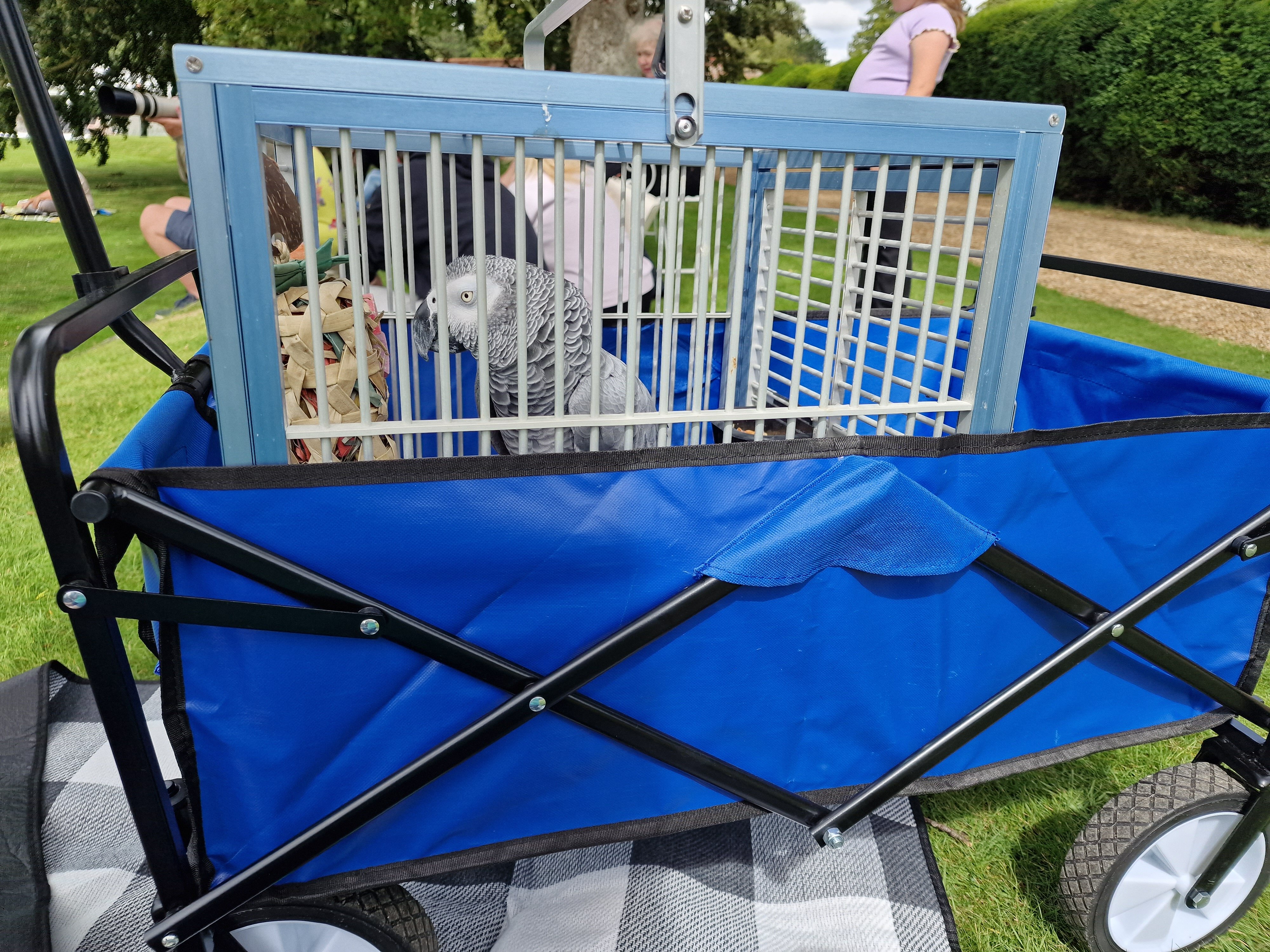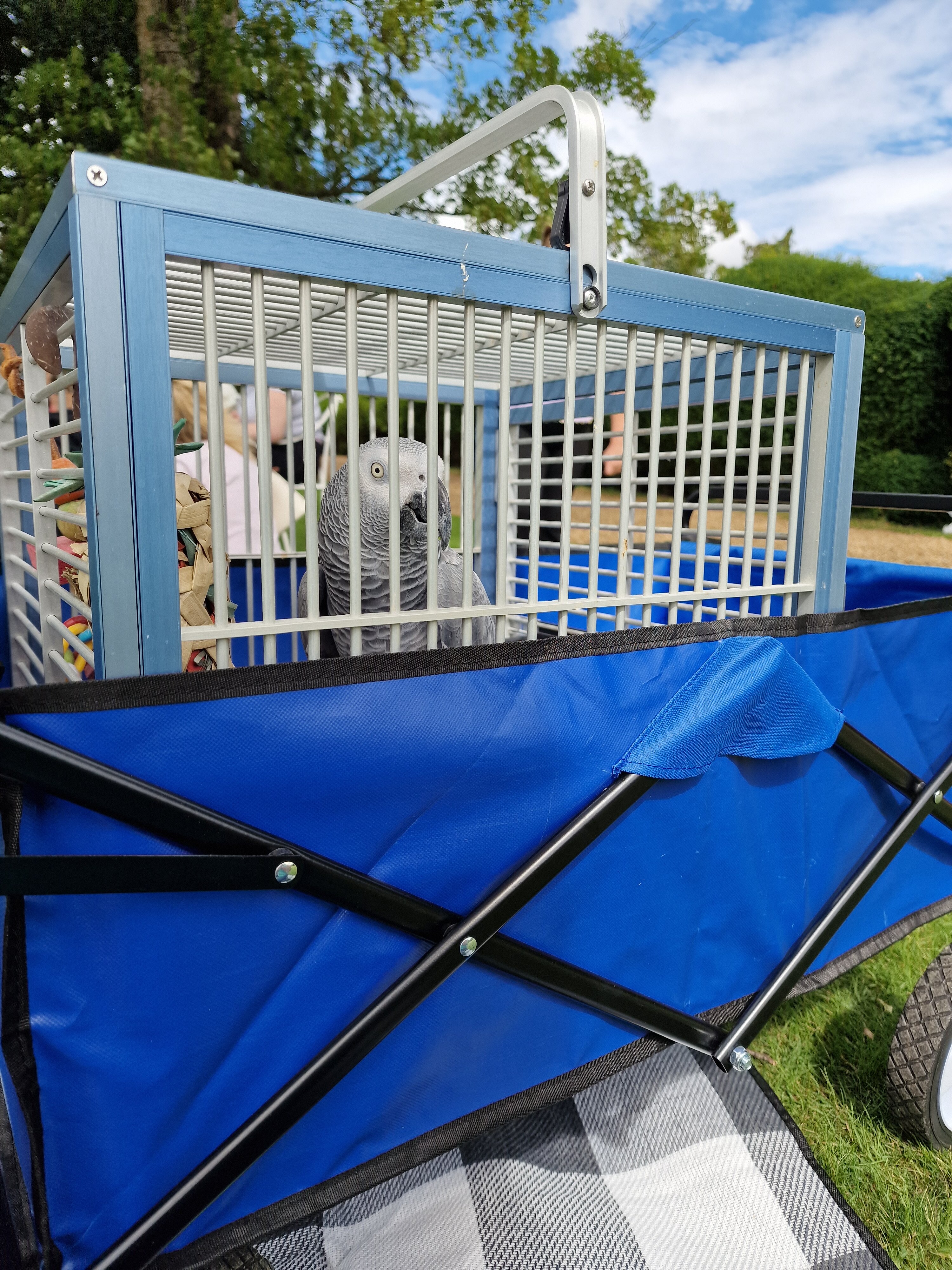 neoow Posted August 15, 2023 Posted August 15, 2023 On Sunday Alfie and I went on a bit of an adventure! We went to a parrot/owner meetup in aid of the World Parrot Trust. It was just under a 2 hour drive each way and it's the first time I've done something like this with him as well as the furthest I've taken him in the car. There were loads of people (and their parrots) and I wasn't sure how he would take to it. His travel cage is heavy and bulky so I bought a trolley to pull him along in. He was a bit worried when we were moving around but settled really well when we stopped. Loads of people came up to say hello to him and give him some attention. He was a little wary of some people but pretty calm about the whole thing overall. I really enjoyed the day too and I think I'll see if there are other events I can take him to in the future, now that I know he won't completely freak out about it. 20230813_153218.mp4 Free flight macaws- this was fascinating to watch! The house/location we were at- the event was all outside on the grounds and thankfully the weather (mostly) held out! 20230813_154523.mp4 This was as the day was winding down- there were lots more people and birds than this there! 20230813_155306.mp4 Alfie's new wheels! This blue and gold macaw is Rio and he took a liking to all the ladies. He landed on me a few times - I was holding a hot chocolate drink that he tried to steal. The next time he landed on me I moved the hot chocolate out of reach so he grabbed my thumb in annoyance. He landed on my back at one point and played with my hair. Then he landed on my arm again later and pinched me a few times. It reminded me of why I don't have nor want a macaw- the strength in their beaks is unreal. He was relatively gentle but it still left bruises! All in all it was a great day out and I was super proud of how well Alfie coped, especially seeing as he's never done anything like this before. He had so much to deal with - the car journey, a new location, his new wheels that we've never used before, so many people and parrots and a few dogs around. Some loud music at times. He took it all in his stride and didn't freak out or panic at all. We were both super tired when we got home! 1