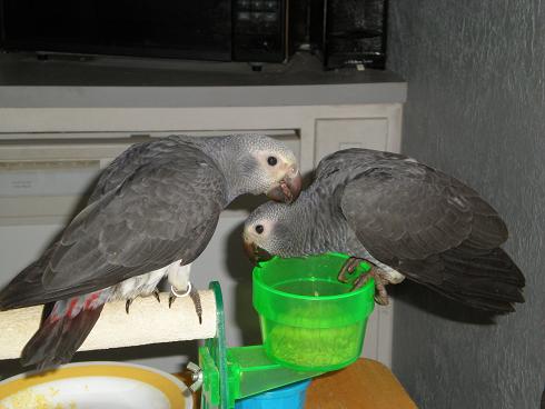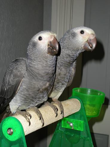 Lyric Posted January 6, 2009 Author Posted January 6, 2009 Updates, updates!! We had some exciting developments over the last few days. On Saturday, Sadie Grey took her first flight. It was a successful short flight without any crashes- hurray Sadie! Today, Sterling followed suit. Also, Sadie said "pretty birdie" to me several times! I was almost beside myself with excitement! I'm hoping Lyric will hear her talking and get inspired. Both Sadie and Sterling vocalize alot but that was the first time I heard something recognizable from them. Both are now weaned from handfeeding and eating great on their own. They are eating pellets, fruits, veggies, brown rice... anything they can get their beaks on. They are definitely great eaters. Here are some updated pics of them, they have really grown and except for the dark eyes, now look like real greys...