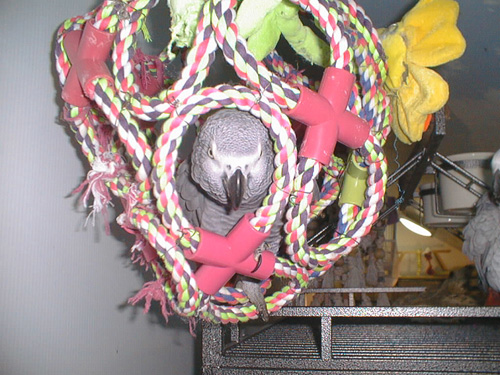 HeatherStrella Posted June 16, 2007 Posted June 16, 2007 I'm hoping to get a picture of him hanging from his ball...but here are some that were taken over this past year.... His small cage in the living room... Heather and Harrison